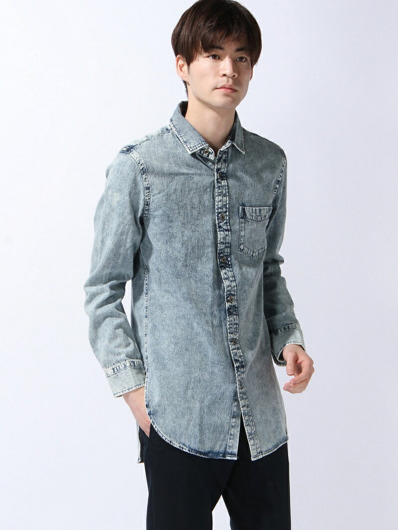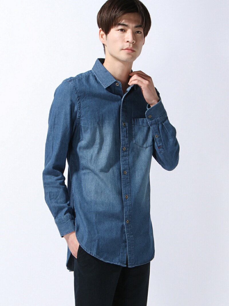 VIBGYOR(ヴィブジョー)スラブデニムレギュラーカラーロングシャツ濃淡のあるスラブデニムを用いた、ヴィンテージムード漂うロングシャツ。